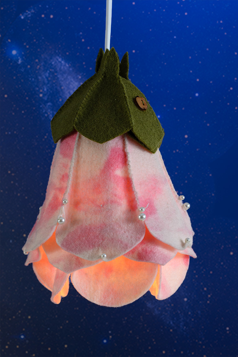 Ein wunderschöner Lampenschirm aus rosa/weiß marmorierten Märchenfilz,