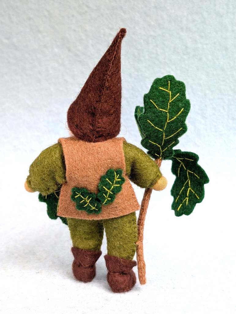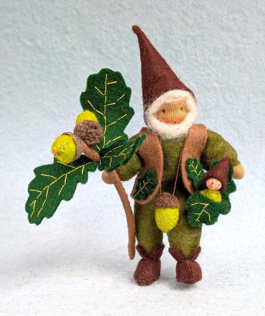 Lernen Sie diesen bezaubernden 14 cm großen Eichelzwerg kennen, der aussieht, als käme er direkt aus dem Wald. Wahrscheinlich hat er sein kleines Haus unter einem Eichenbaum gebaut, denn er hält einen Eichenzweig mit Eicheln in der Hand. Um seinen Hals trägt er eine Eichelkette und in seinem Arm ein süßes Kind, sicher eingebettet im Eichenlaubbett.