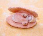 Ein kleines Baby in eine Muschel aus Wollfilz. Das Baby hat ein Holzköpfchen.