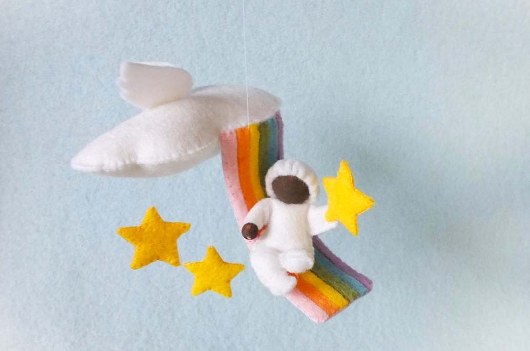 Mit dieser Bastelpackung kann man ein kleines Baby auf einer Regenbogenrutsche (oder -Brücke) aus Wollfilz anfertigen. Die Wolke und auch die Rutsche sind ca. 9 cm. Für den Kopf liegt eine unbemalte Holzperle von 15 mm bei, die Sie eventuell auch braun färben können.