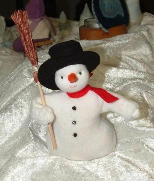 Dieser Schneemann mit Köpfchen aus weißem Trikot und Körper aus weißem Nickystoff darf auf dem Wintertisch nicht fehlen.